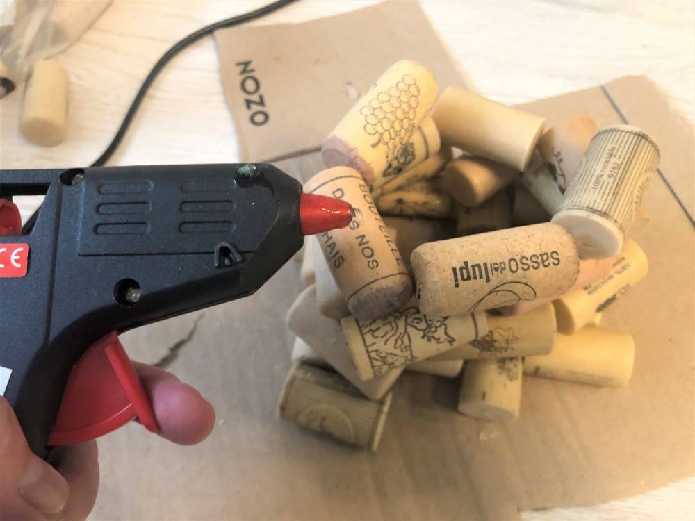 Изделие составляется в хаотичном порядке: пробки приклеиваются по окружности, но не в строгом порядке. Эффект хаоса и небрежности на руку этой поделке.