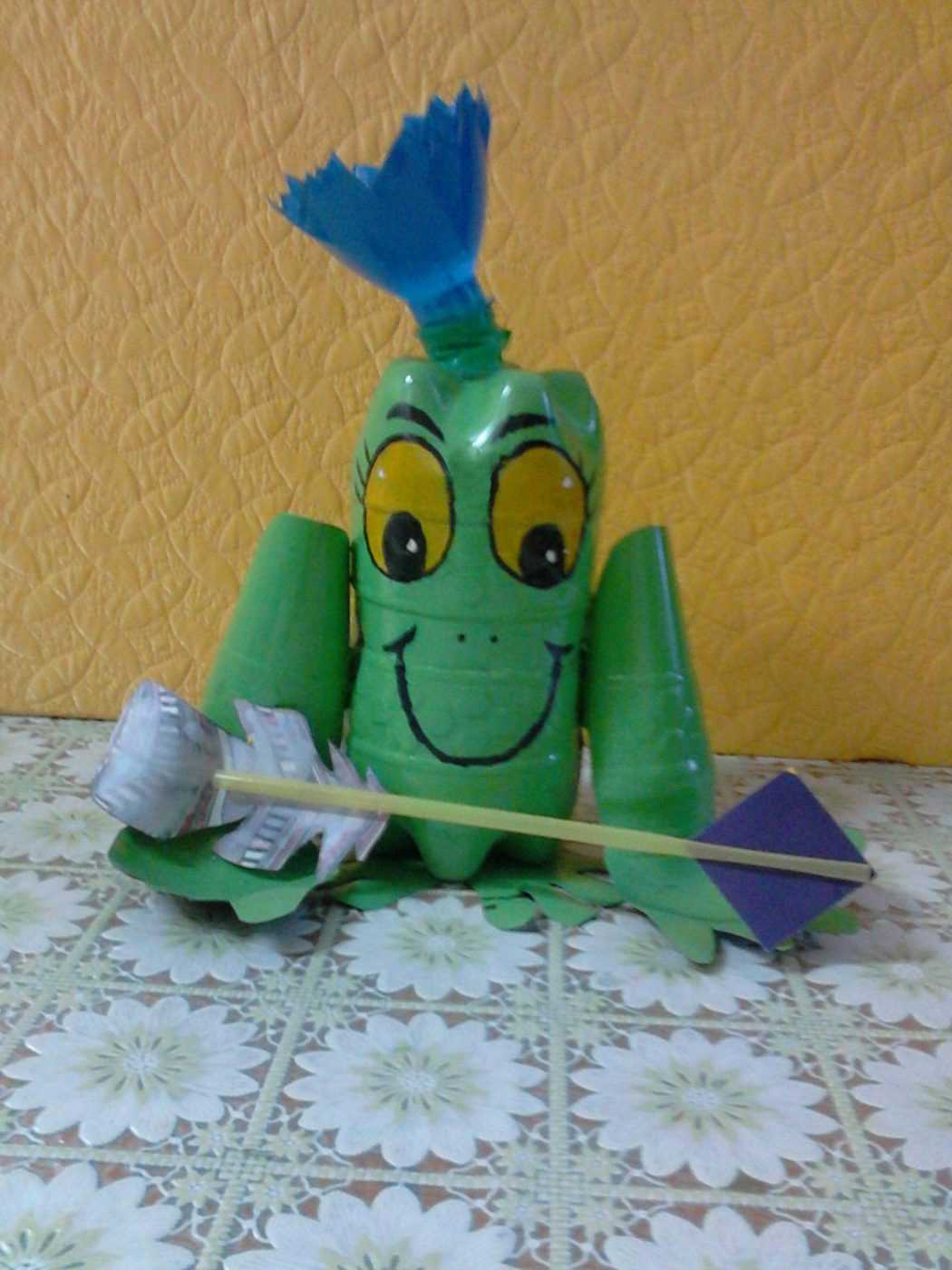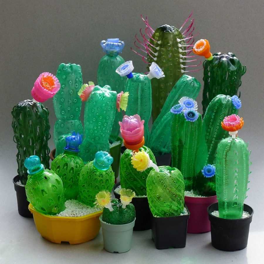- Из пластиковых бутылок выстригаются листочки различного размера произвольной формы из расчета 15-20 штук на 50-сантиметровый стебель (на основе длиной 25-30 см можно разместить 5 нитей-стеблей), раскрашиваются зеленым цветом различных оттенков. На основу так же нанизывается несколько листочков, расположенных между нитями и по краям.