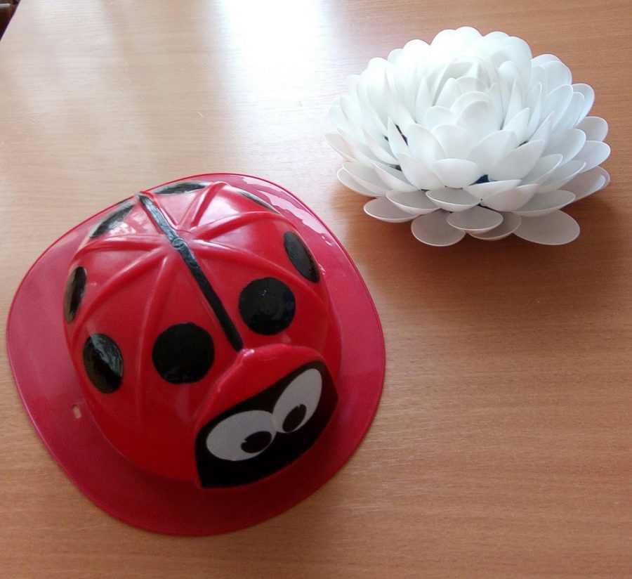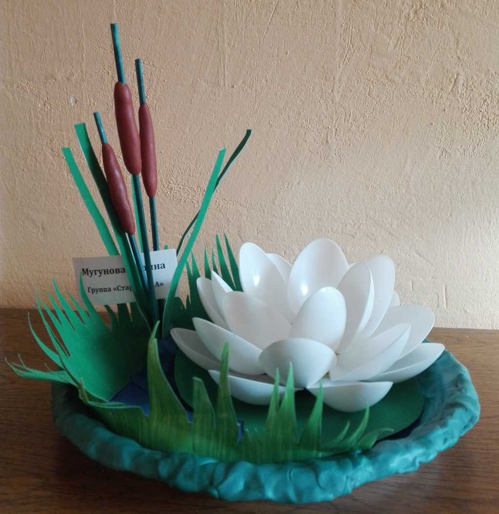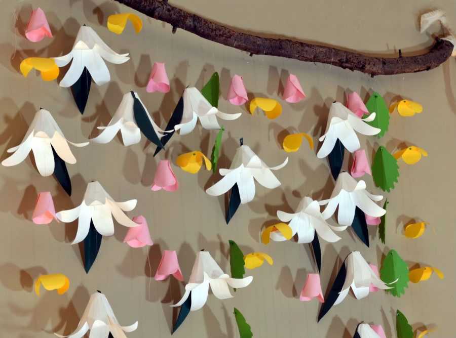 Листья можно выстричь как из крышки пенопластового контейнера, так и из пластиковой бутылки. Листья и стебли окрашиваются зеленой краской. После ее высыхания листья нанизываются на стебель с помощью небольших прорезей, сделанных в них. Затем на стебле закрепляются отрезки проволоки, на которые будут нанизаны белые чашечки цветов.