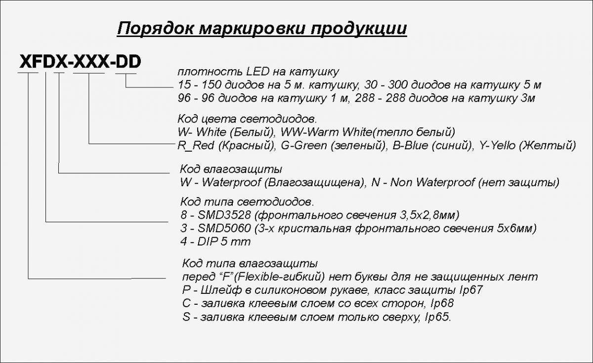 Разбираясь в схеме подключения светодиодной ленты, необходимо понимать, что означает маркировка разных моделей. От этого зависит правильность выполнения монтажа и эксплуатации.