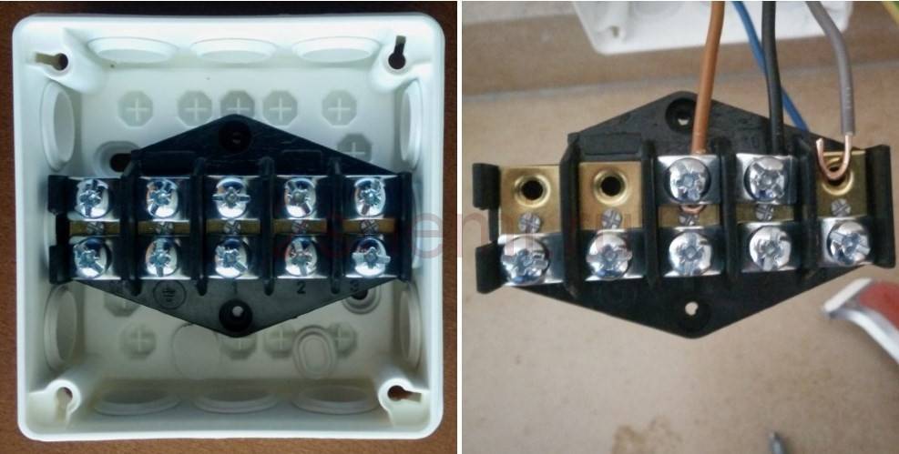![]() | При помощи медных или латунных перемычек, идущих в комплекте с панелью, соединяем между собой контакты 1, 2 и 3 – «фаза» и 4, 5 – «ноль». Подключаем провода к клеммам в соответствии с цветовым обозначением. |