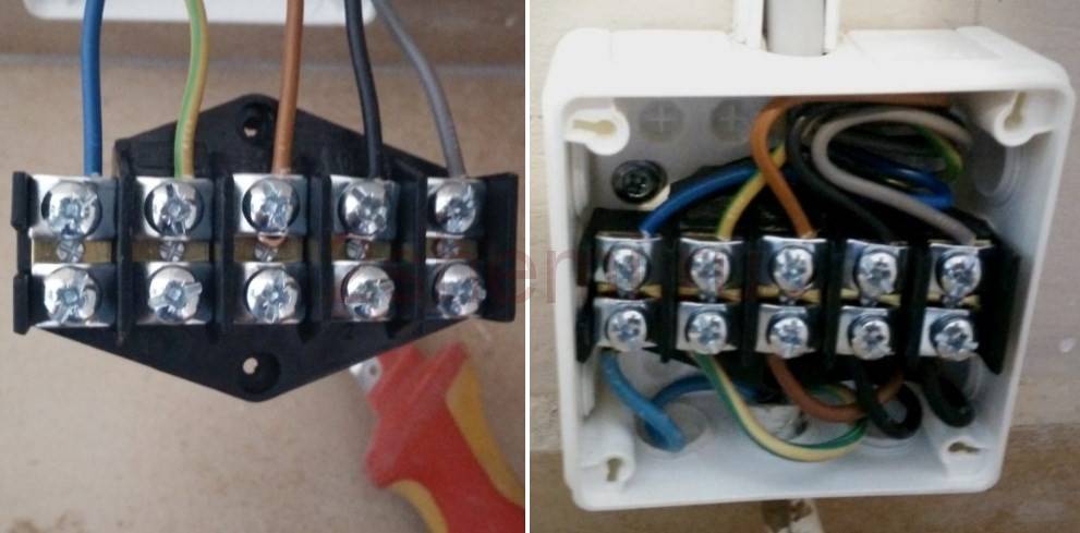 Шаг 4. Очистите кабели от изоляции в распределительной коробке. К боковым клеммам прикручивайте коричневую и синюю жилы (фазу и ноль), а к центральной желтую с зеленой полоской (заземление). Закройте коробку крышкой.