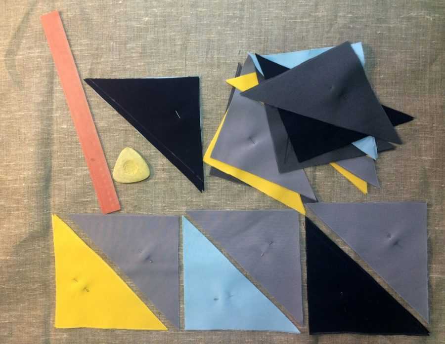 Первым делом надо хорошенечко отутюжить все ткани и вышивку. Из разноцветных лоскутков вырезаем квадратики 5*5см. И выкладываем вокруг вышивки, как нам нравится, в любой последовательности. Перетасовываем несколько раз, что бы результат понравился.