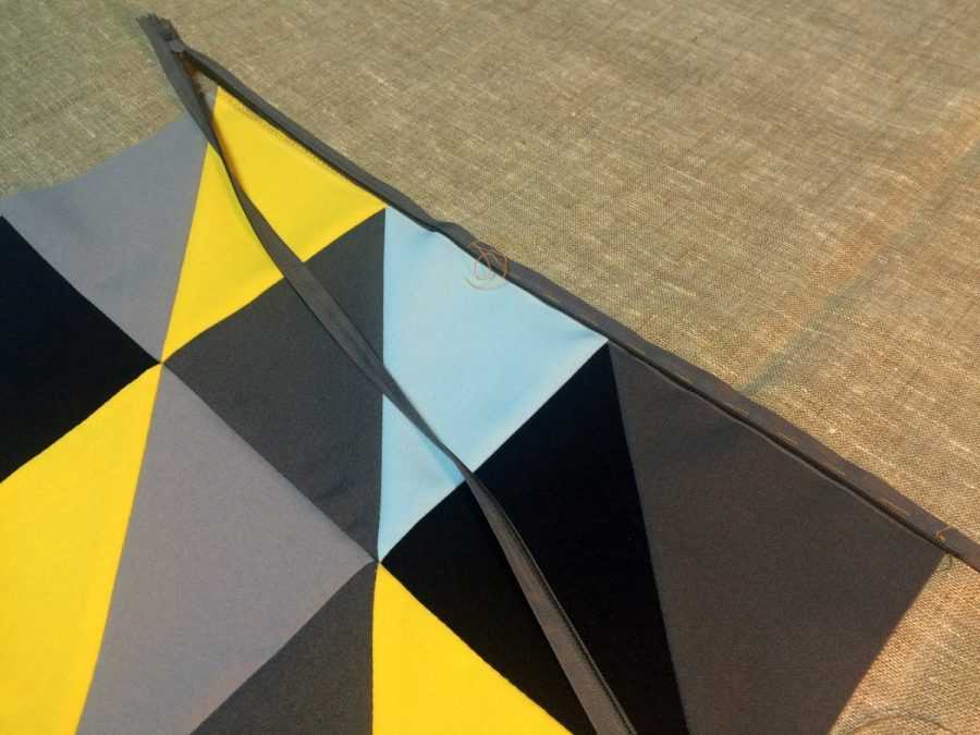 Полученную бейку пришиваем к изнаночной стороне наволочки. Для этого слаживаем срезы к срезам и пришиваем на ширину лапки. Формируем уголки.