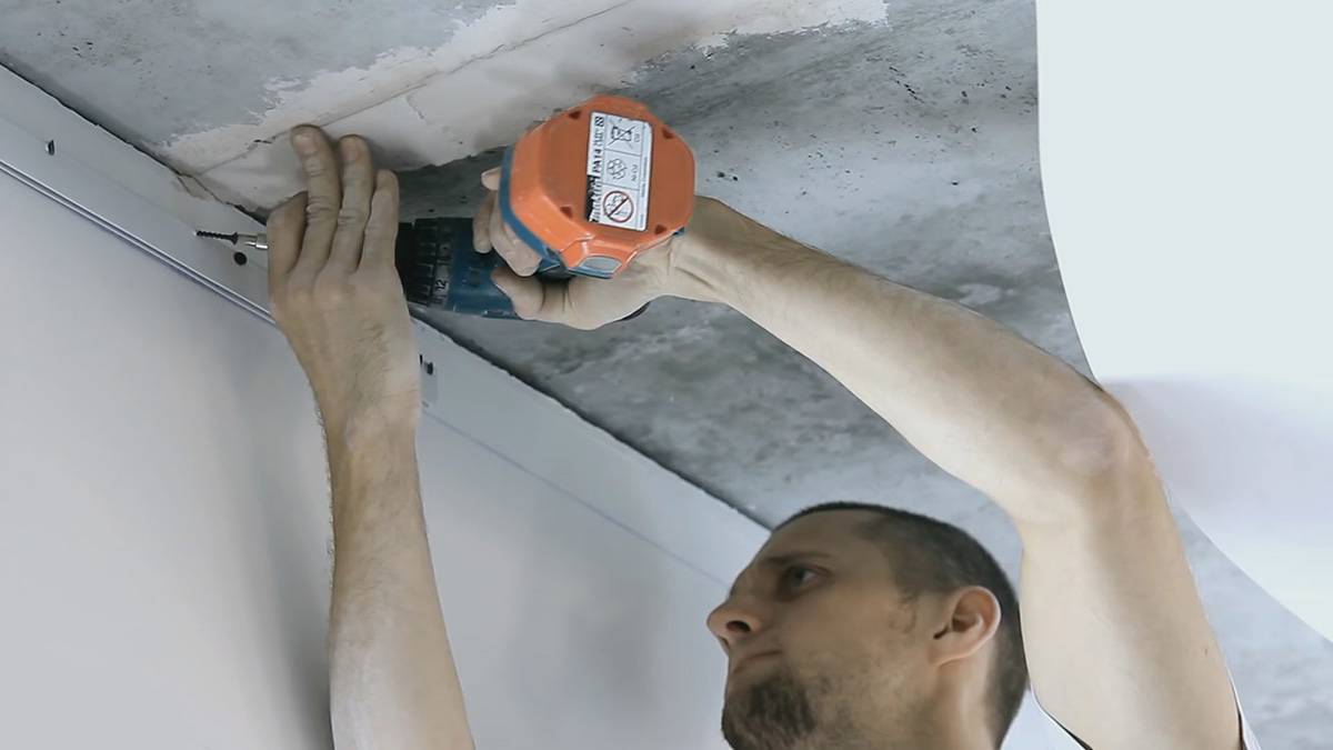 Каркас для натяжного потолка крепится к стене саморезами по дереву, которые вкручивают следующим образом: