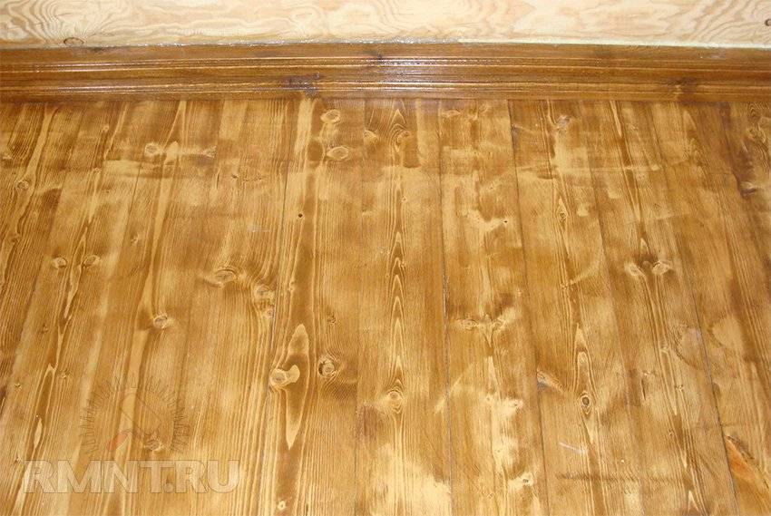 Каждую доску крепят ко всем лагам. Они должны плотно прилегать одна к другой. Зазор между досками не должен превышать 1 мм. Для сплачивания досок применяют скобы или сжимы. Гвозди для крепления используются длиной больше толщины досок в 2–2,5 раза. Конец дощатого пола не доходит до стены на 10–20 мм. В дальнейшем зазор перекрывается плинтусом.