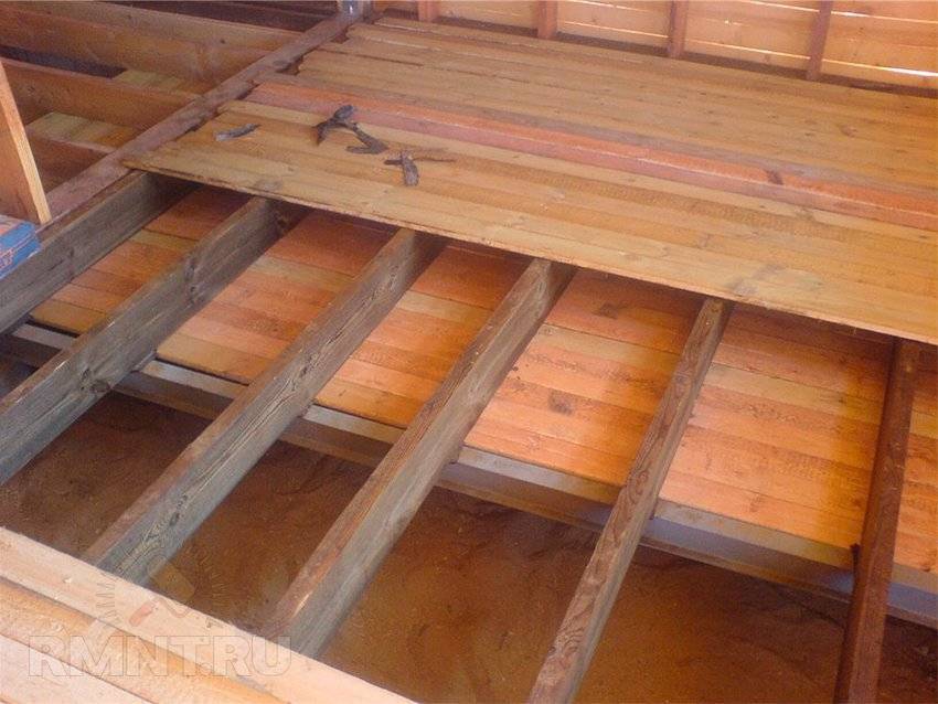 - Выставив лаги, снизу к ним прибивают так называемый черновой пол — подшивку из самого дешёвого, бросового материала, например, срезанного горбыля. На этот конструктивный элемент в дальнейшем будет укладываться теплоизолятор. Предварительно его также следует обработать антисептиком.