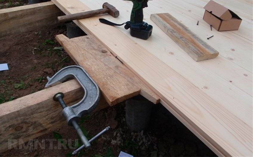 - Сверху по лагам укладываются доски. Следует помнить, что настил необходимо покрывать водоотталкивающим покрытием.