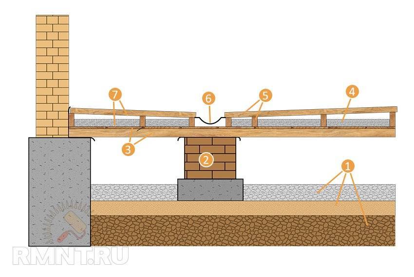 Утепленный непротекающий пол. 1. Грунт, песчаная подушка и насыпной утеплитель. 2. Кирпичный столб. 3. Лаги и черновой деревянный пол. 4. Утеплитель. 5. Лаги и чистовой пол, уложенный с уклоном в сторону желоба. 6. Желоб. 7. Поверх чернового пола укладывается паропроницаемая мембрана, поверх слоя теплоизоляции выстилается гидроизоляция