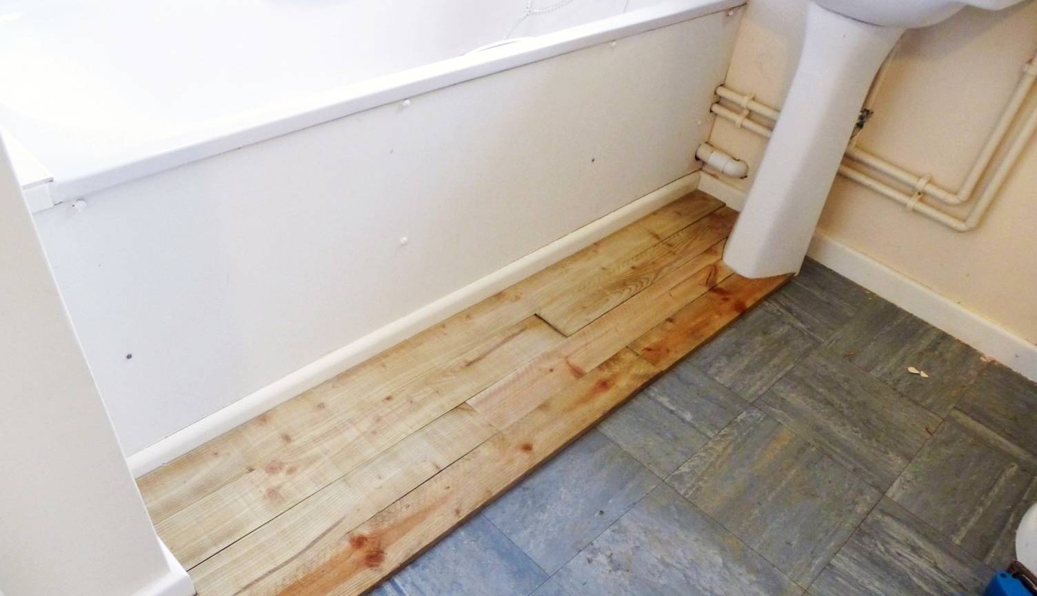 Пол в ванной также внимательно осматривается. Только в этом случае целью является выявление гнили и поврежденных досок. Если такие будут найдены, то их необходимо демонтировать и заменить на новые. Кроме прочности балок, необходимо выявить расстояние, на котором уложены лаги пола. Чтобы поверхность пола в ванной могла полностью выдерживать оказываемый на нее вес, необходимо убедиться, что лаги находится на расстоянии, которое не превышает 500 мм. Если это не так, тогда обязательно выполняется монтаж дополнительных опор.