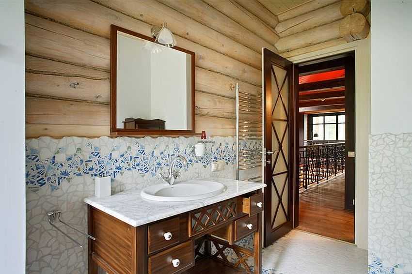 Вообще, использовать можно любые отделочные материалы пригодные для ванных комнат. Просто мало это практикуется — натуральная древесина стала слишком редким отделочным материалом, чтобы в деревянном доме использовать привычные обои или краски.