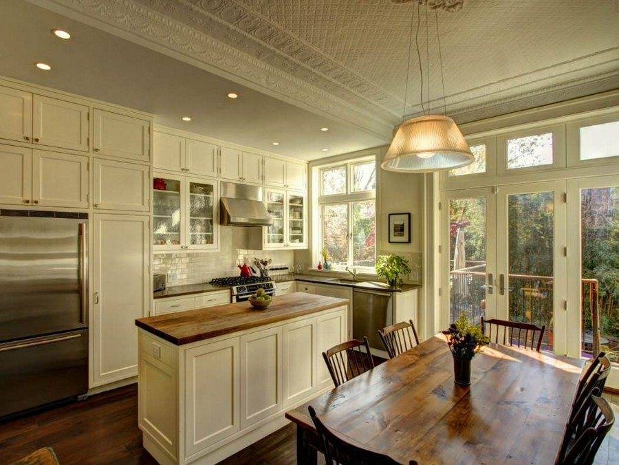 Если у вас два уровня потолка, один из них по цвету может сливаться со стенами, другой же дополнять гарнитур, стол, шторы, люстра, картина, напольное покрытие или кухонный фартук – к примеру, как на этих фото.