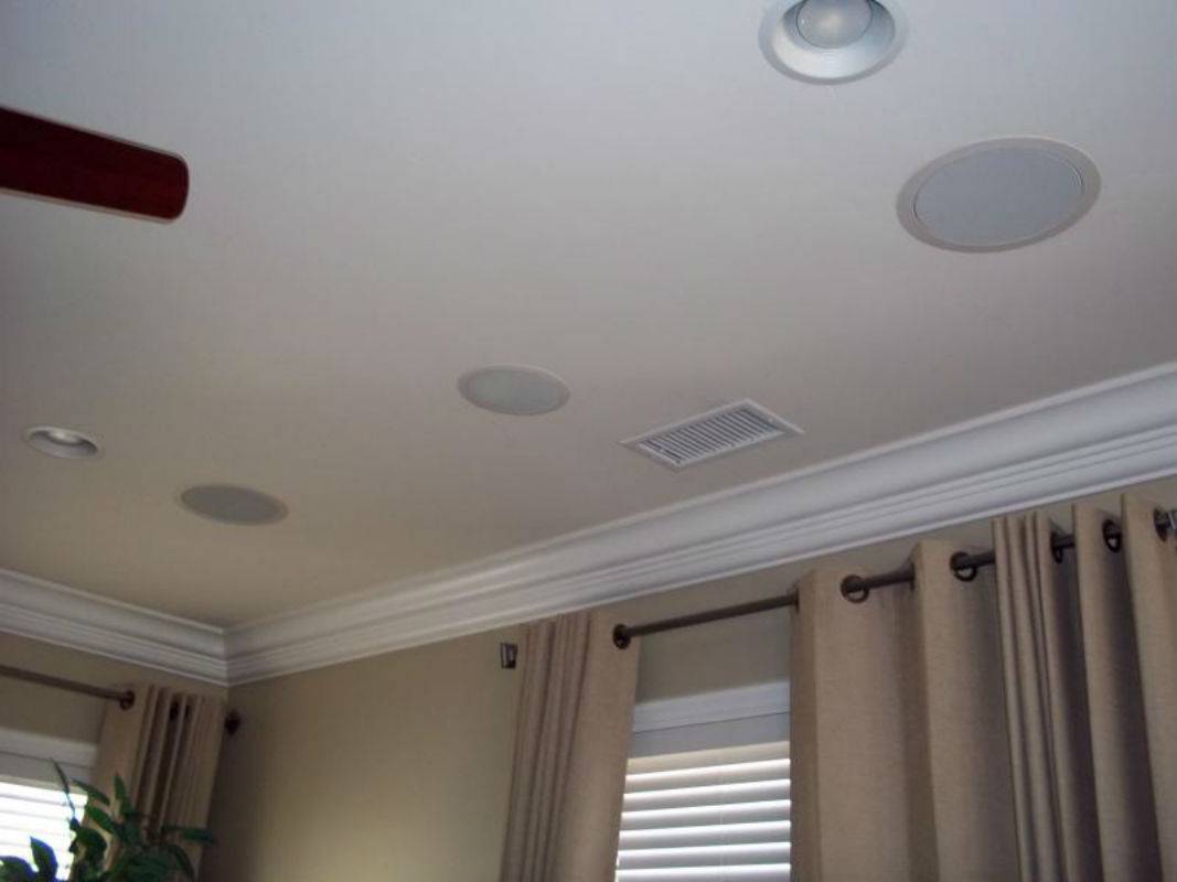 - Встраиваемые потолочные динамики не портят интерьер комнаты, потому что совершенно невидны в интерьере. Незаметно ни проводов, ни самого корпуса прибора.
