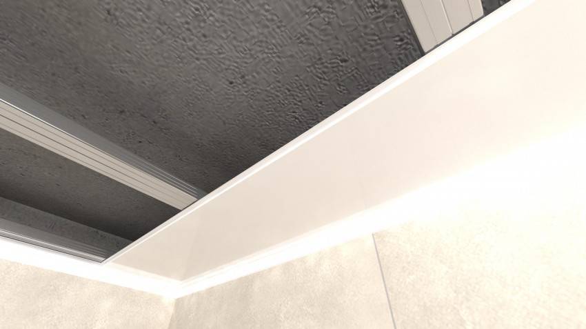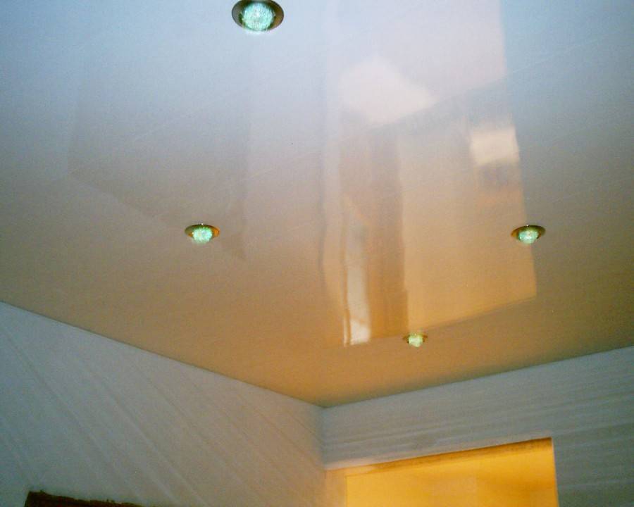 Сразу отметьте расположение светильников: для них может понадобиться дополнительное пространство. При температурах выше +90C пластик не горит, но может деформироваться, поэтому лучше приобретать светодиодные или галогеновые светильники.