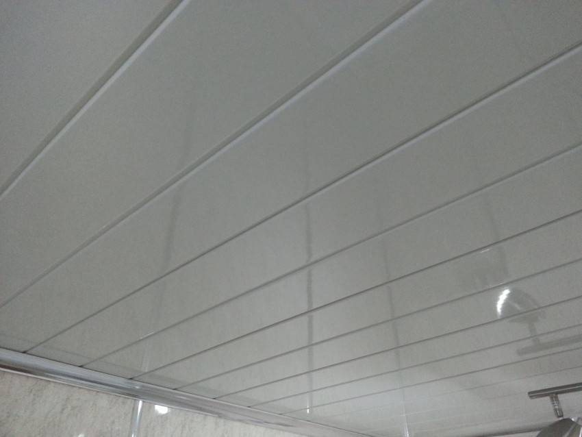 При установке пластиковых панелей необходимо отступить от каждой стены по 5 мм. Такое расстояние выдерживается для свободного хода пластика, иначе есть риск получить «волнистый потолок» в случае перепада температур. Каждая панель вставляется одна в другую в специальные пазы и для надежности закрепляется саморезами.