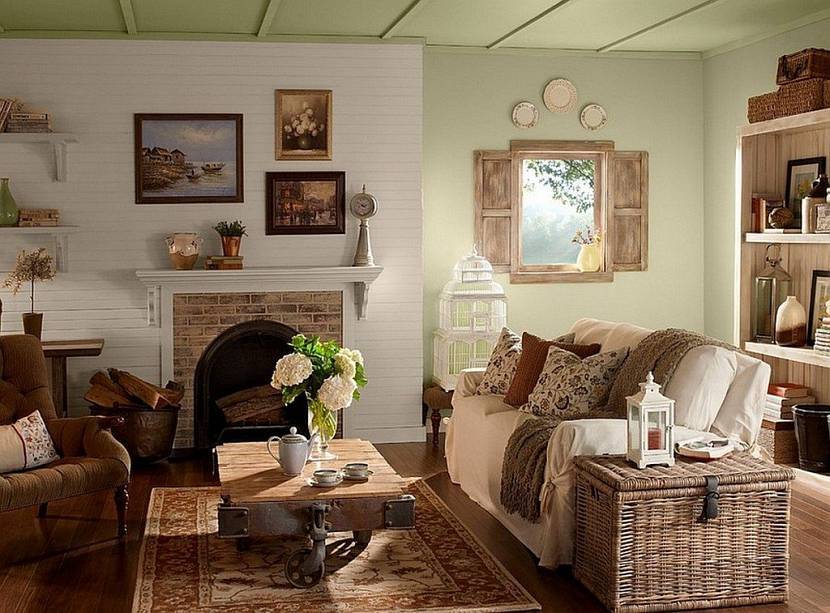 - Приобретенную мебель расставляют слегка небрежно, избегая симметрии. Бабушкин сундук и плетеное кресло-качалка сделают комнату уютнее.