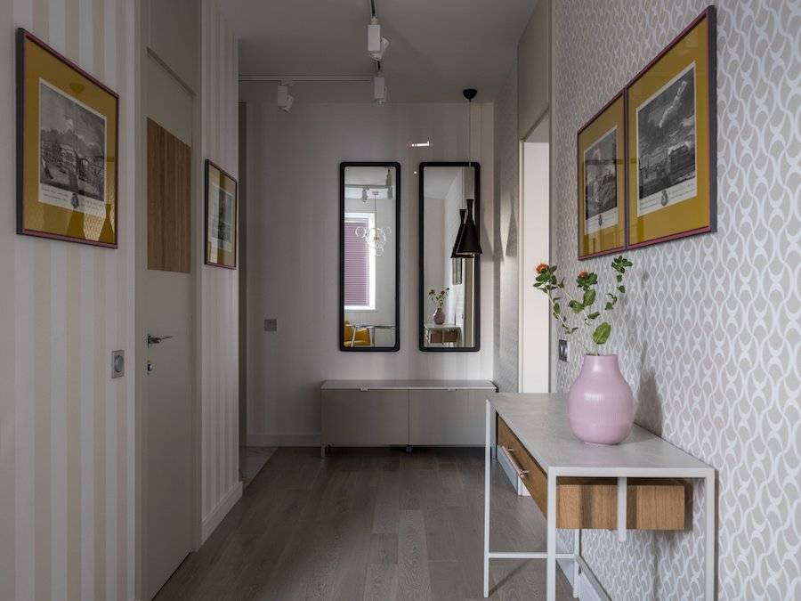 Для неё, как и для маленьких помещений, дизайнеры используют светлые тона стен, пола и мебели. Использование на полу комбинированных материалов позволит зонировать узкое пространство, и разграничить участок для хранения одежды и обуви, и место для холла.