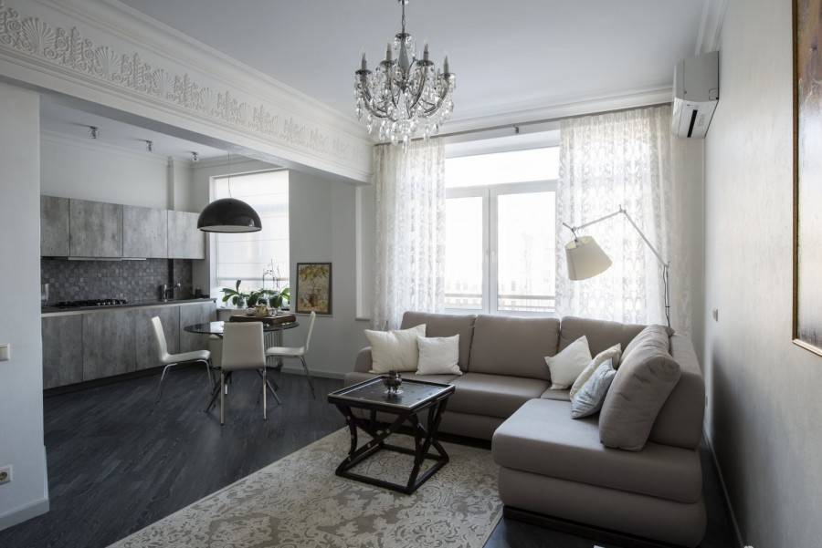 Чтобы создать ощущение простора часто приходится заниматься перепланировкой помещения. Для получения нужного результата объединяются гостиная с кухней, если внутренние перегородки не являются несущими. Проще всего это направление реализовать в студиях.