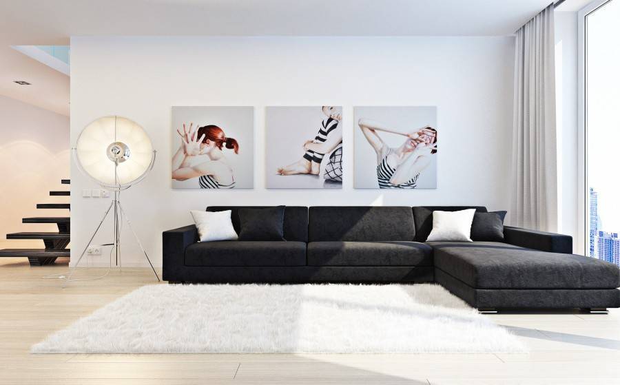 Если стены кажутся слишком пустыми, то можно повесить картину современного художника или несколько черно-белых фотографий в большом формате.