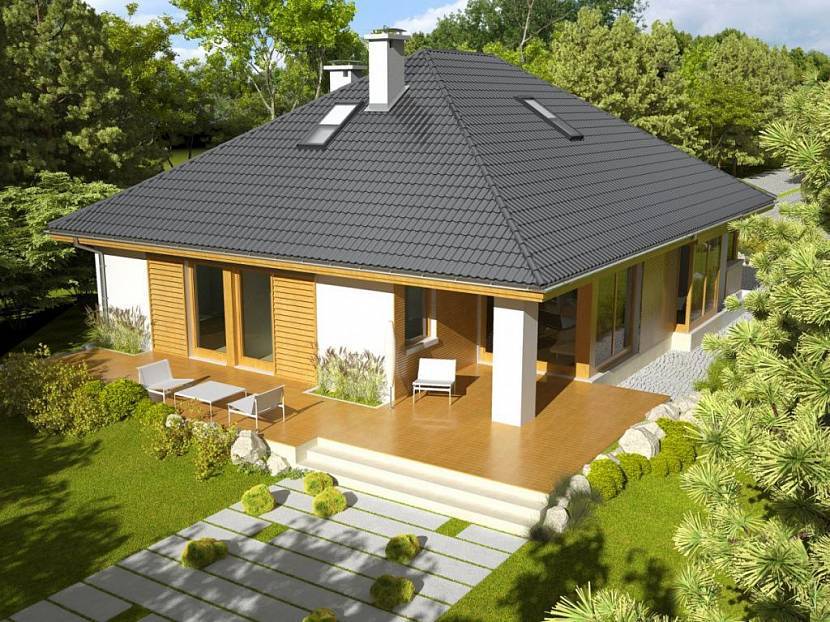 Замечено, что в регионах с большим количеством осадков одноэтажный дом с вальмовой крышей – лучший из возможных вариантов возведения малоэтажных зданий. Площадь кровли у четырехскатной крыши больше, чем у двускатной кровли. Особенность конструкции каркаса такова, что она позволяет отвесы карниза спускать за пределы несущих стен. Таким способом часто при строительстве формируется козырек, который надежно защищает фасадную отделку от воздействия атмосферных осадков.