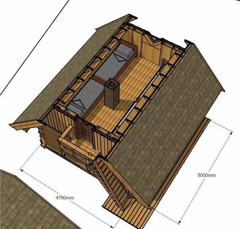 При создании бани с мансардной крышей необходимо добавить внешнюю лестницу со стороны террасы на верхний этаж. Это поможет сэкономить немного места внутри.