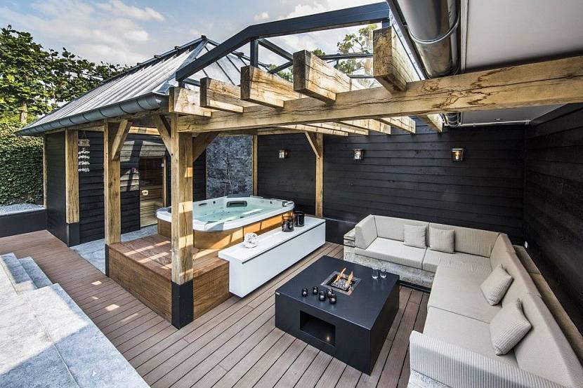 Сама беседка в этом плане будет куда устойчивее и долговечнее, чем ее просто пристраивать к бане – ведь теперь она, как промежуточный элемент, еще и статична. Как раз ей не страшны ни движения почвы, ни ее вспучивание. И даже крыши всех трех зданий можно соединять воедино – как известно из законов физики, все, что монолитно — всегда крепче и надежнее, чем собранное из отдельных элементов. А оборудовать в ней самой можно что угодно: и пати с искусственным прудом, и бассейн, и зимний сад, и барбекю – все, что душе угодно.
