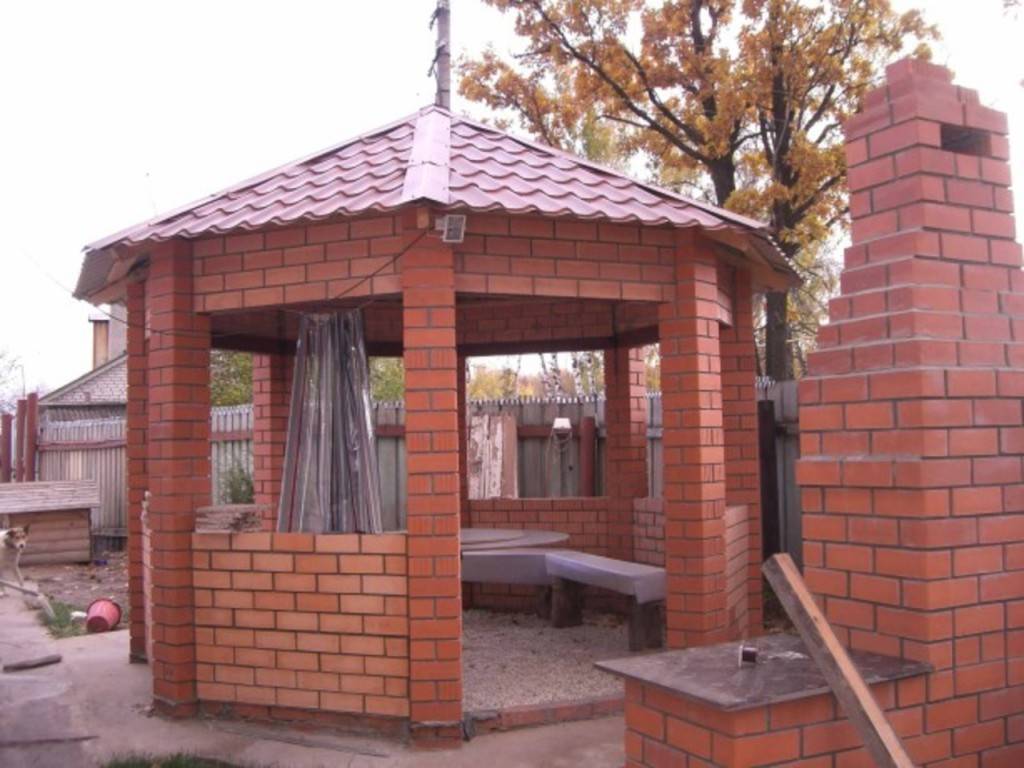 На фото выше можно увидеть один из реализованных проектов беседки из кирпича. Особенностью этого варианта навеса из кирпича является восьмиугольная форма. В такой беседке из кирпича будет удобно разместить стол и с каждым из сидящих за ним будет легко поддерживать зрительный контакт. Лавочки могут быть сделаны стационарными или съемными, все зависит от предпочтения пользователя. В качестве кровельного настила для навеса из кирпича выбрана металлочерепица, которая прекрасно справляется с возложенными на нее функциями. Можно заметить, что барбекю вынесено на площадку рядом с беседкой. Это сделано для уменьшения габаритов самого строения.
