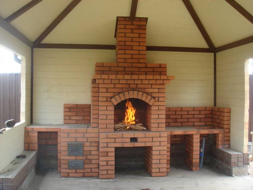 встроенная печь представляет собой специальное оборудование из кирпича, которое включает духовку, коптильню и гриль. Такая конструкция позволяет готовить любые виды блюд. Чтобы ее возвести требуется серьезная кладка;