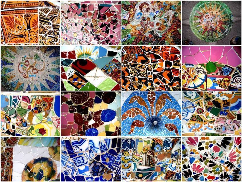 Калейдоскоп. Радиальные рисунки из мелкой разноцветной плитки, размером, как правило, не более 15 х 15 см. Количество оттенков может быть различным – от двух-трех похожих тонов до десятков разнохарактерных цветов.
