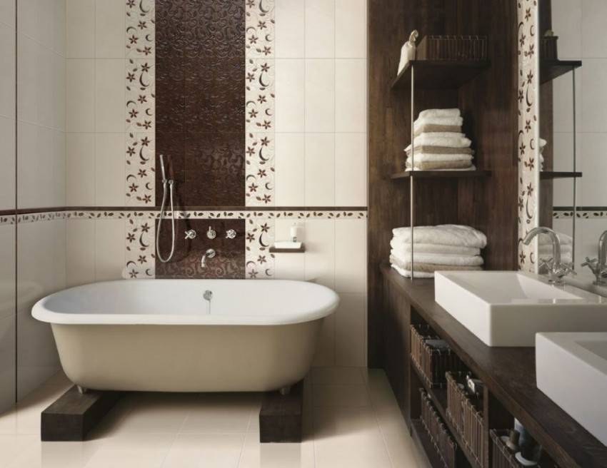 Если облицовка стен выполняется плиткой разных оттенков, светлый тон нужно разместить в верхней части, а темный цвет в нижней. Это позволит зрительно увеличить пространство. В качестве декоративного элемента используют плинтусы и бордюры с орнаментом.