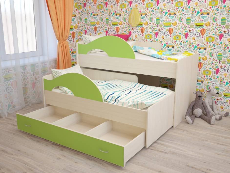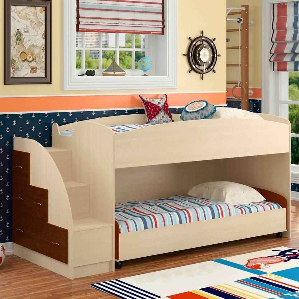 Для более взрослых ребят выбирают кровати с выдвижным спальным местом. В дневное время суток оно прячется в нишу. Чаще всего такие изделия имеют две постели, иногда даже три. Каждая из них выдвигается дальше верхней, образуя лестницу. Такие оригинальные детские кровати не сильно высокие, из них практически невозможно выпасть, но они редко имеют в комплекте бортики. Удобны для многодетных семей.