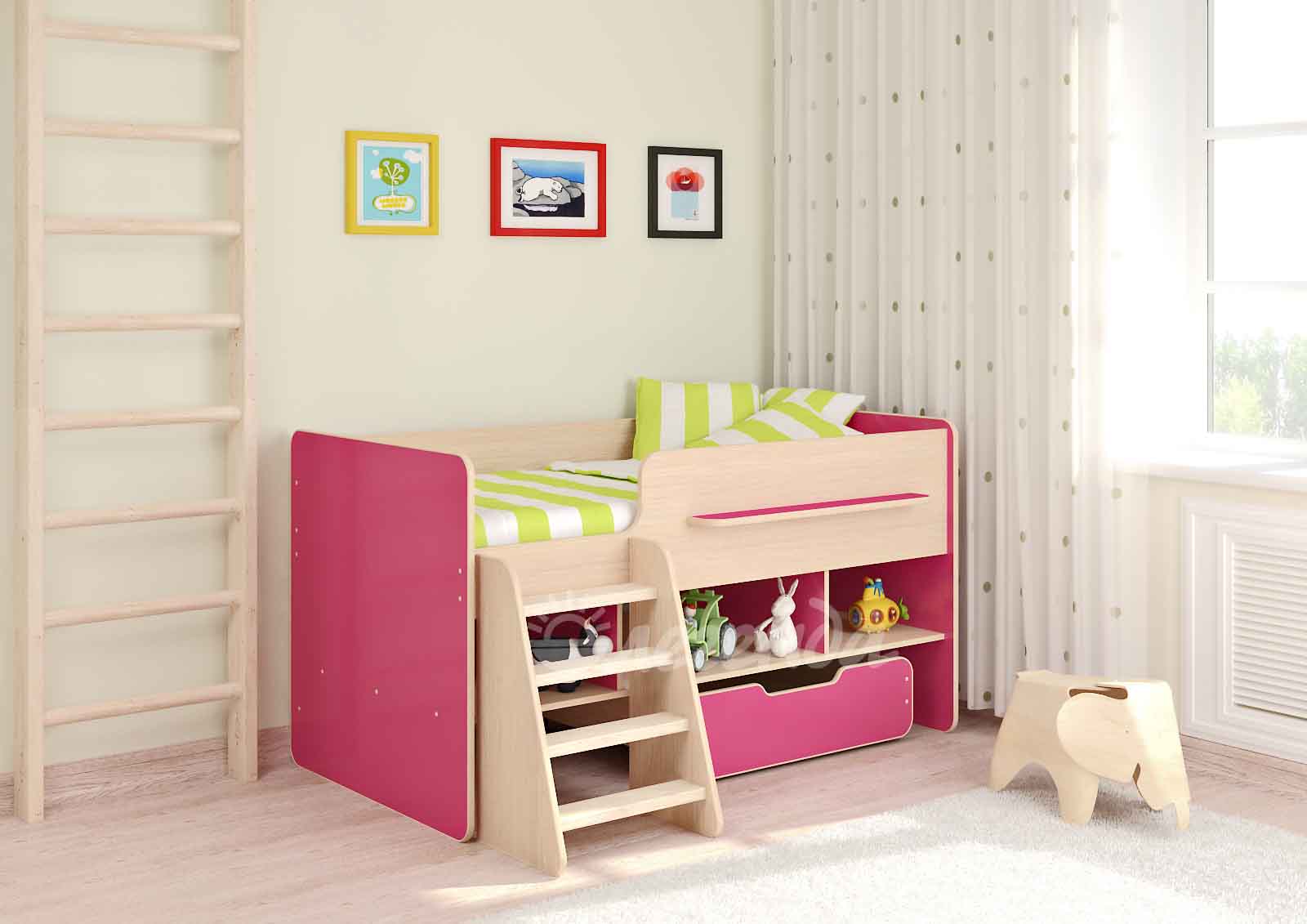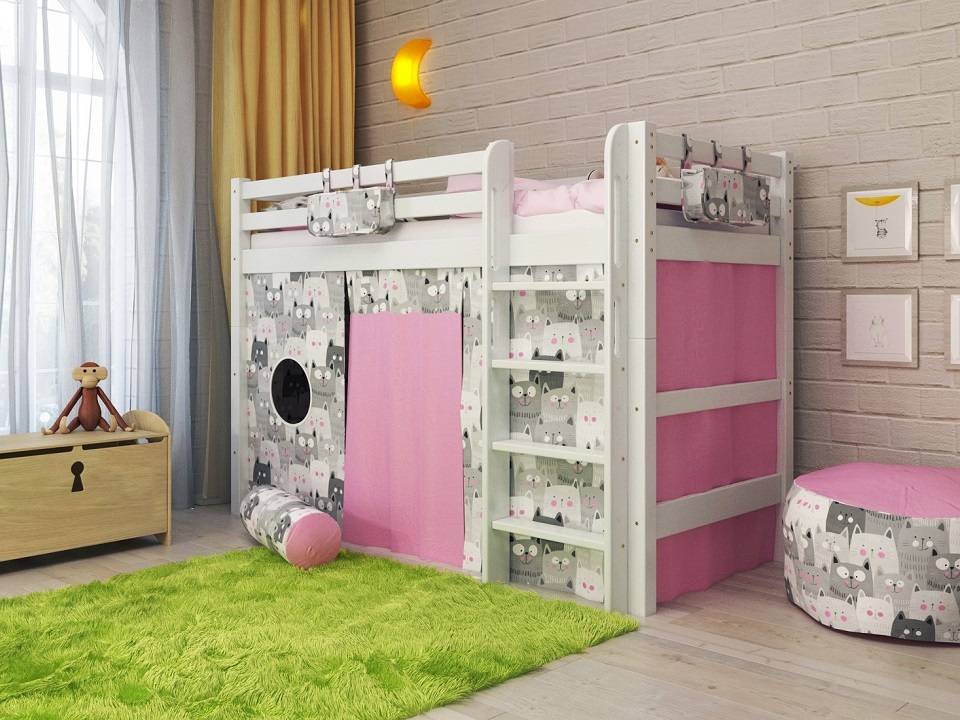 Кровать-чердак удобна для использования в небольшой комнате, так как позволяет сэкономить место. На верхней полке обустроено спальное место, туда можно попасть по лестнице. Нижний ярус зачастую отводят под письменный или компьютерный стол. Иногда там располагают диван-кровать для детей от 3 лет. Такой вариант подойдет для двоих детей.