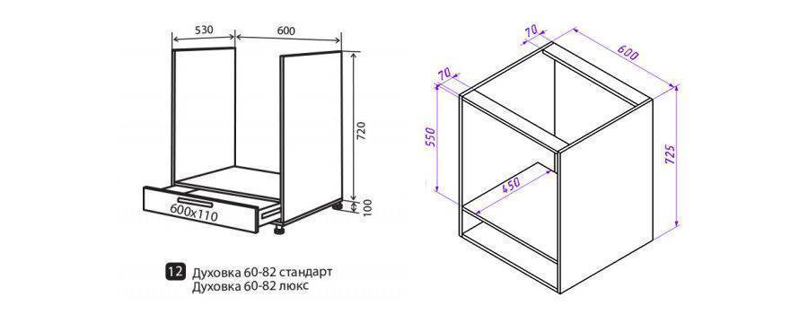 Стандартным считается гарнитур со столешницей шириной 60 см. Высота фасадов при этом либо 703 мм, либо 716 мм (для некоторых производителей возможна высота 713 мм). Каркас рассчитывается так, чтобы с лицевой стороны можно было установить духовку на уровне остальных фасадов, а сзади оставалось место для подвода коммуникаций и нормальной циркуляции воздуха. Если тумба покупается в собранном виде, глубина боковых стенок может быть меньшей, чем соответствующий параметр духовки. После установки допустим небольшой свес корпуса, главное, чтобы осталось дополнительное место для крепежа.