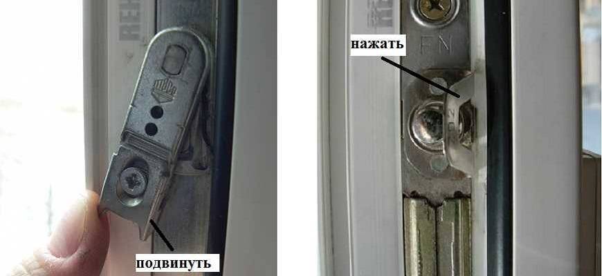 Иногда и эта регулировка не помогает. Тогда требуется прижать верхний угол к раме. Для этого есть другой винт — на поворотно-откидном механизме. Чтобы был доступ к этому винту, придется открыть окно сразу в двух положениях. Для этого створку открывают, прижимают блокиратор. Он обычно бывает двух конструкций — в виде запорной петли или язычка (смотрите на фото ниже).