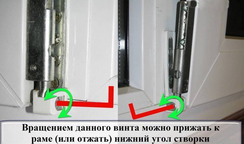 Регулировка нижней петли сводится к тому, что это позволяет либо приподнять створку на несколько миллиметров, либо сдвинуть в сторону. Как правило, к подобной регулировке прибегают в том случае, когда оконная створка цепляет за оконную раму в нижней части окна.
