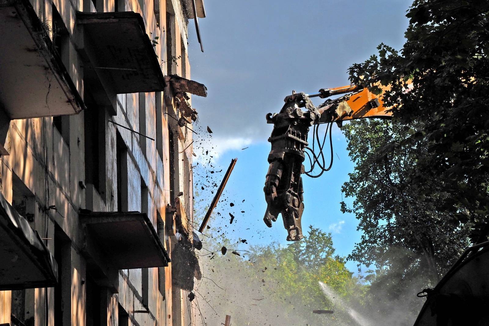 На втором этапе железобетонный остов здания сносят с помощью экскаватора-разрушителя, оборудованного гидравлическими ножницами. С их помощью, например, срезаются перемычки над окнами.