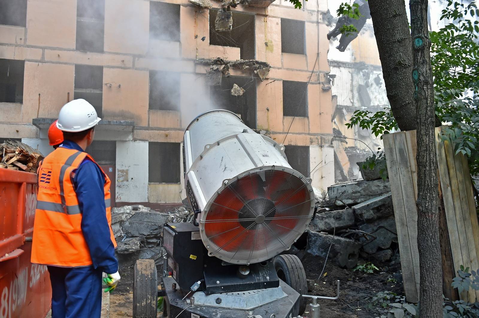 Количество образующейся пыли при сносе снижают с помощью гидропушек, распыляющих воду под большим давлением.