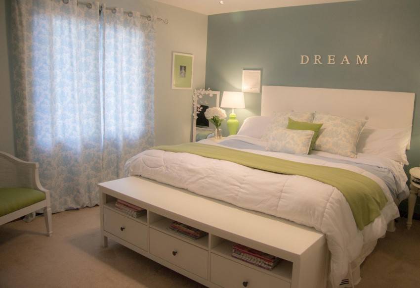 Так как комната не имеет больших габаритов, ее оформление должно выполняться только в светлых оттенках. Спальня визуально станет намного больше, появится ощущение воздушности.