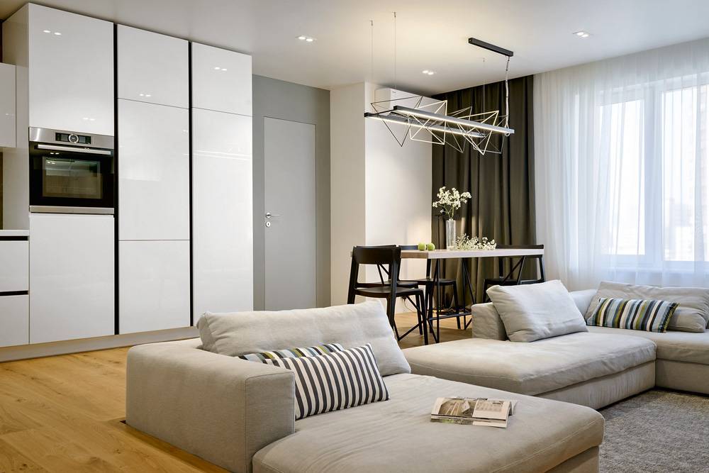 - в объединенной кухне и гостиной из-за малых размеров помещения зона отдыха будет находиться в тесном контакте с бытовой техникой и кухонной утварью.