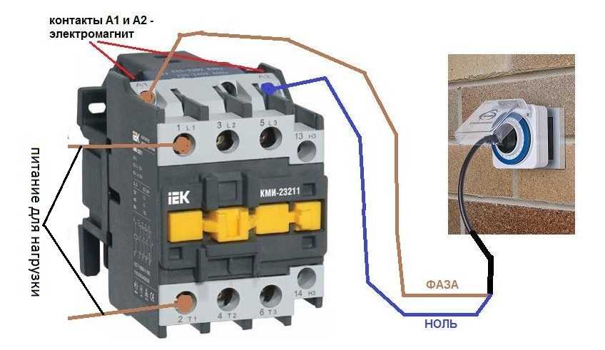 Следует отметить, что неважно, на какие контакты подается управляющее однофазное напряжение, в виде «нуля» и «фазы». В данном случае, провода с контактов А1 и А2 можно поменять местами, что никак не повлияет на работу всего устройства