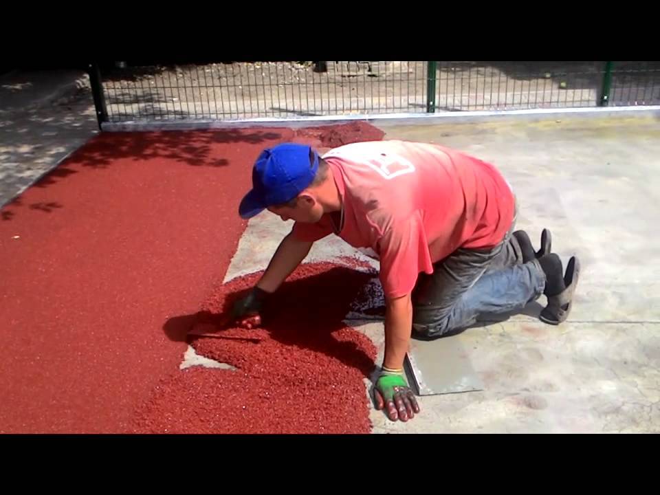 Крошку перемешивают с полиуретановым клеем до однородной консистенции, наносят на поверхность ручным или машинным способом. Покрытие получается гладкое, без швов.