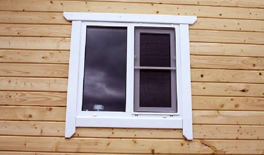 Рамы в деревянном строении вставляют в обсаду. Деревянные обналичники также фиксируют к окосячке на расстоянии 10-15 см от нее. В качестве крепежа используются: