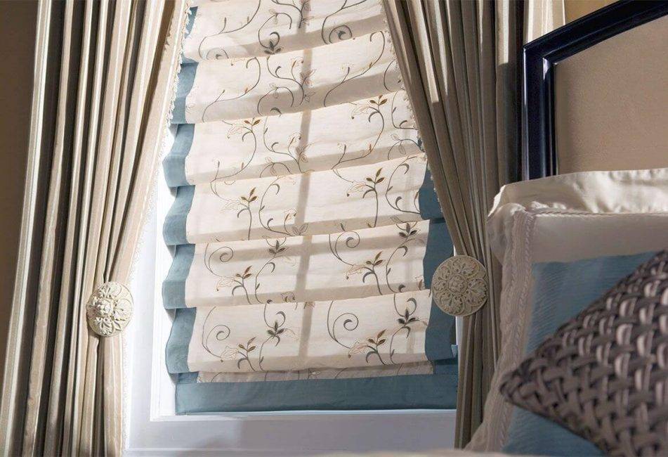 При необходимости римские шторы прекрасно сочетаются с портьерами или тюлем