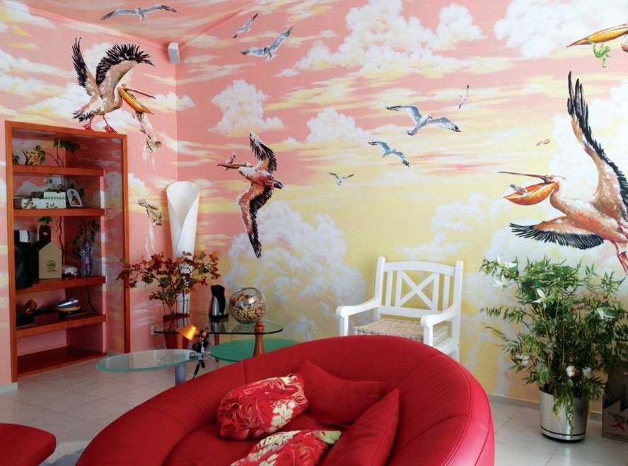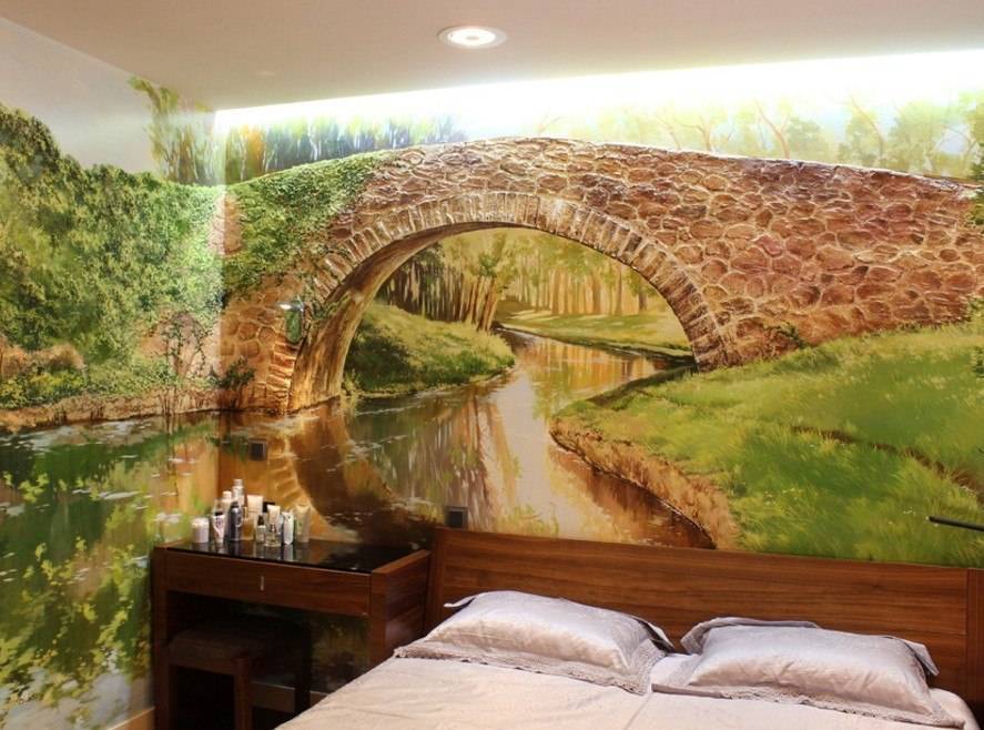 В кухне хорошо показали себя сюжеты с натюрмортами и старенькими городами. Это создает дополнительный уют. Рисунок в спальне должен вас расслабить и успокоить. Можно нарисовать ангелов или же цветы. Морские пейзажи дополнят ванную комнату. Панорамные пейзажи понравятся вашим гостям с первых минут пребывания в гостиной.