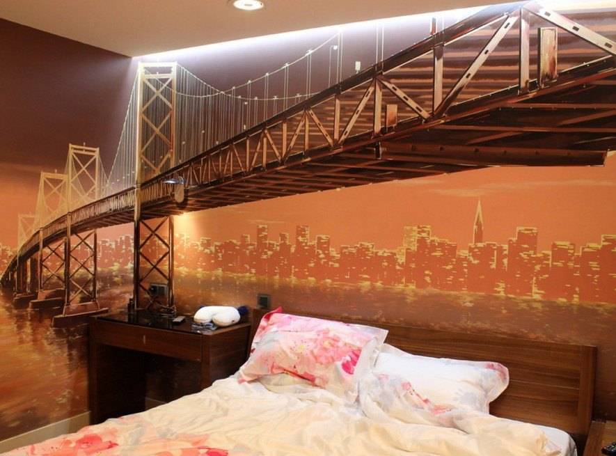 В комнате для гостей небольшого размера, лучше выбрать изображения окон на одной из стен, а также террасы или ведущие вдаль дорожки и лестницы.