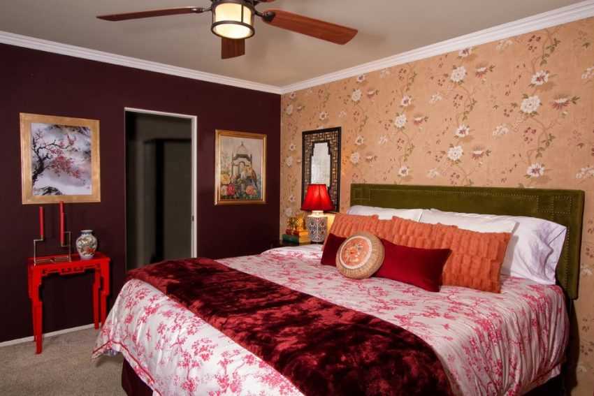 Обилие броских подушечек с вензелями, милых сердечек и пледов, нестандартных прикроватных светильников дарит праздничную жизнерадостную энергетику. Фоновая красная яркая стена в спальне создаёт удачный тандем с чёрным изголовьем постели, не делая обстановку кричащей. Ложе может быть круглого типа, находясь под балдахином, а узорчатыми коврами будет подчёркнута восточная стилизация.