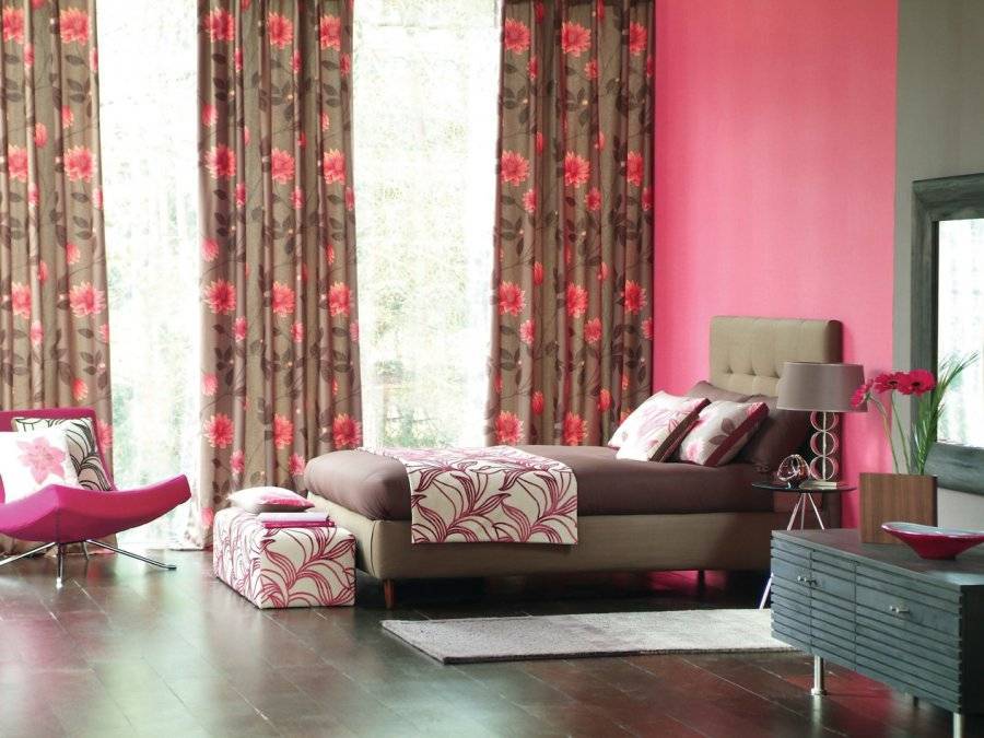 Гардины одного тона прекрасно гармонируют с единым дизайном и некоторыми предметами декора. В данном случае возможно изменить и интенсивность цвета. Если стены однотонные, подберите яркие занавески. Следуя нашим рекомендациям, у вас получится оригинальная спальня в розовых тонах.
