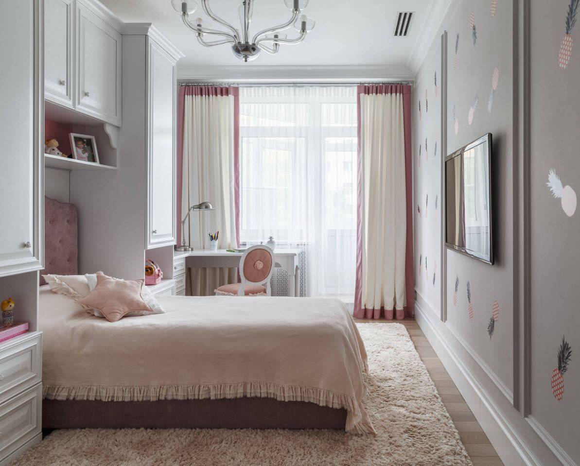 Нежная розовая занавеска из полупрозрачного тюля в комнате юной модницы
