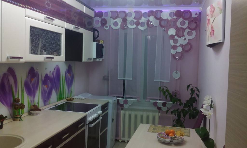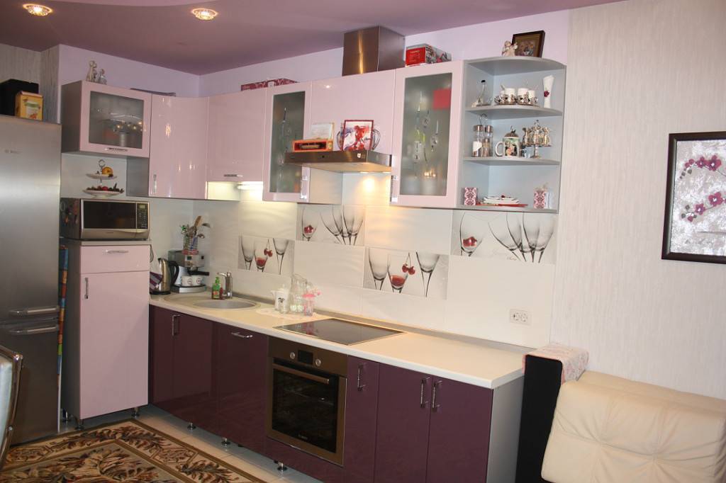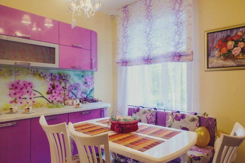 Если же окна кухни выходят на юг, то вы можете выбирать холодные тона: лавандовый, малиновый, маджента, фуксия и пр. как на следующих фото.
