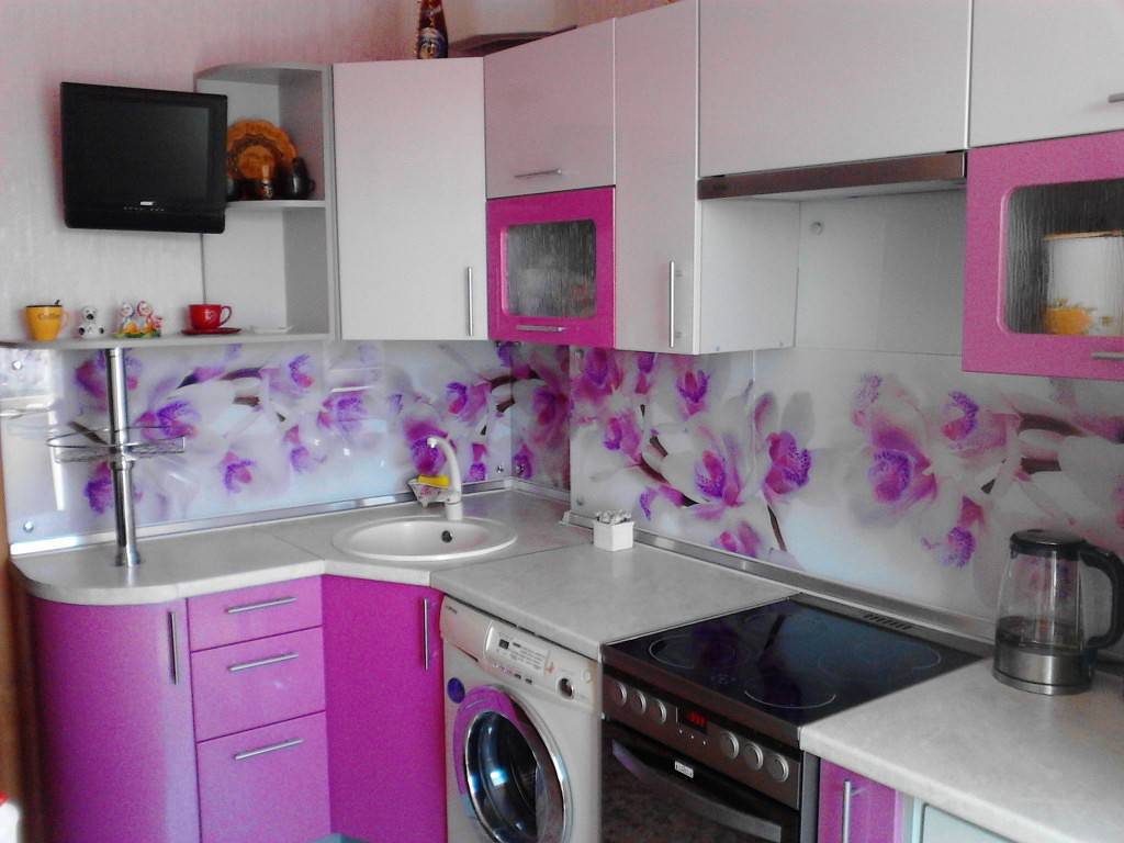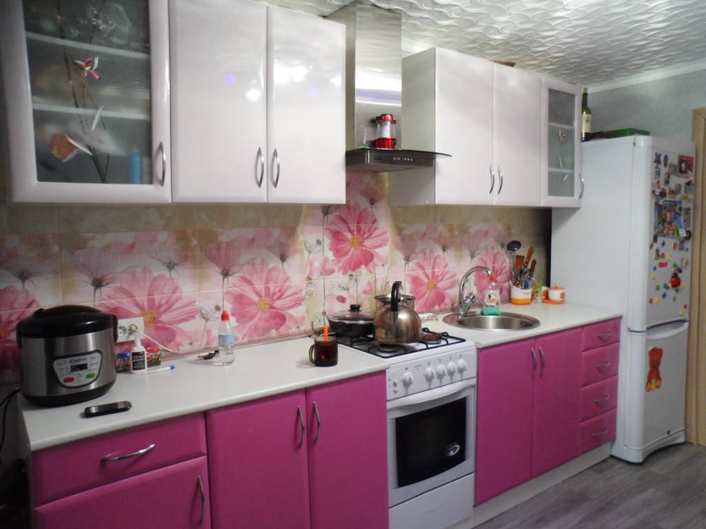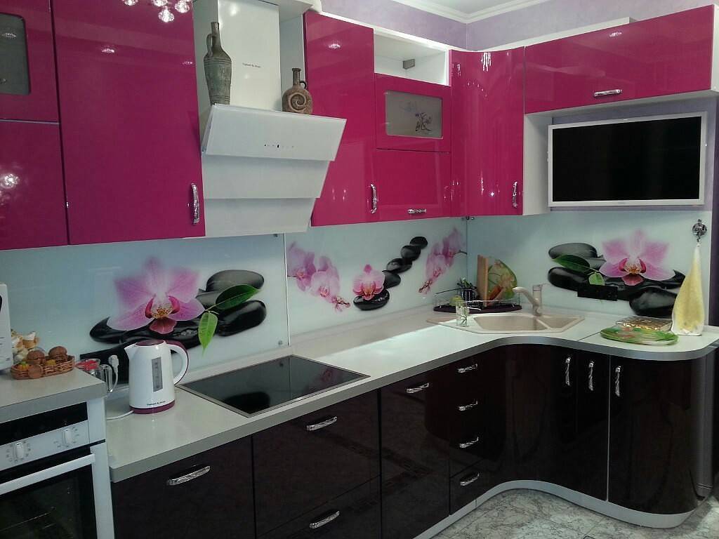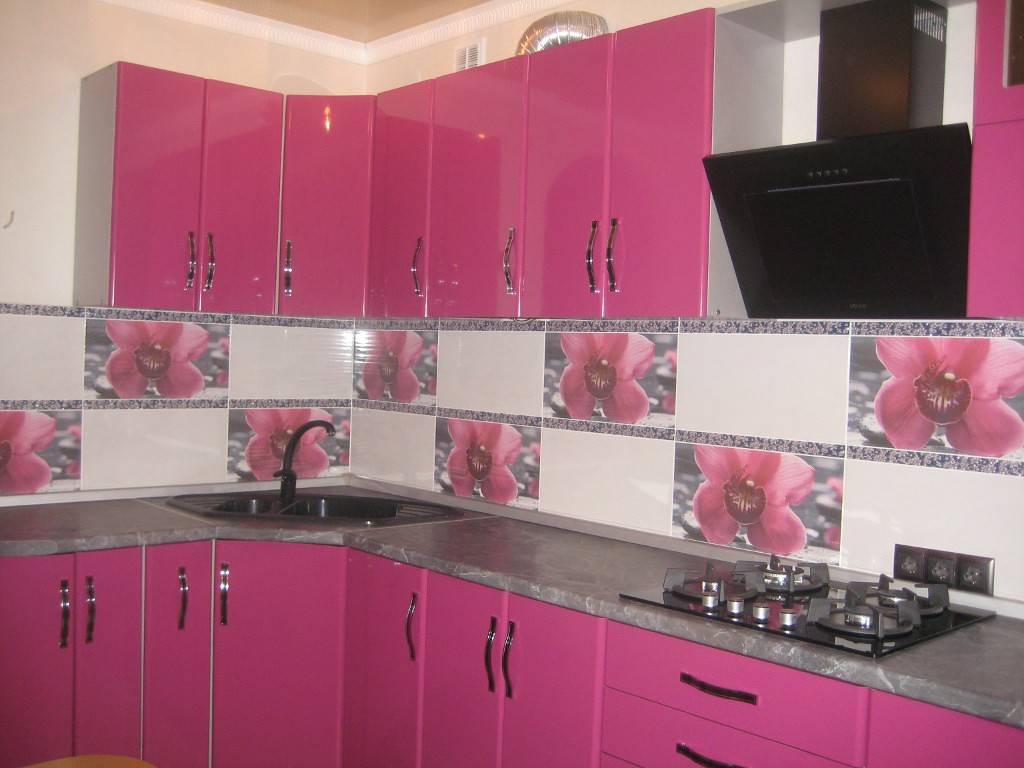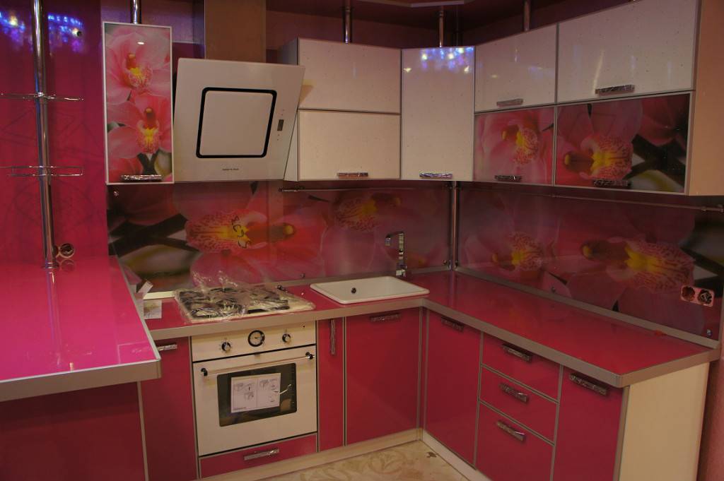 Кислотные и яркие цвета розового уместно сочетать с элементами из хрома, стекла или металла. Дополнят картину фотообои, либо фотопечать на фартуке или самих дверцах шкафов.